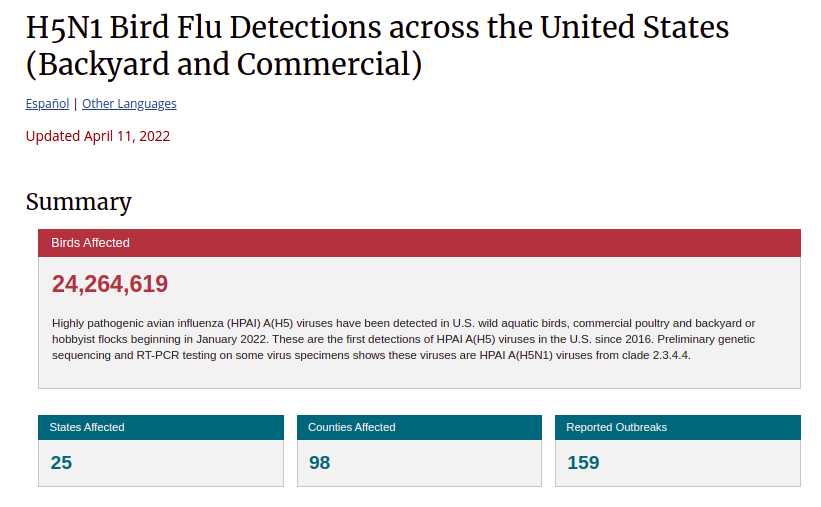 In the United States, as of April 11th 2022, there have been 159 identified outbreaks, and as a result, over 24 million birds have been “depopulated” in efforts to suppress the particular spread of HPAI H5N1. These outbreaks are detected on both backyard & commercial scale operations, ranging in size of a flock of 5 birds to a flock of over 5 million birds. Thus, a single positive result has the potential to trigger the “depopulation” of someone’s entire flock, whether it’s a handful of backyard hens, or millions of birds living and working in the equivalent of sweatshop conditions.